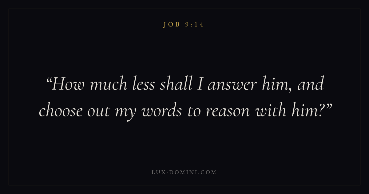 Books / Job / Chapter 9 / Verse 14 ← Job 9:13 Job 9:14 Job 9:15 → How much less shall I answer him, and choose out my words to reason with him? Download verse card Share on Twitter Share on Facebook Pin it ✦ Key themes Suffering and trialsWisdomJustice and mercyPeaceSuffering Read with Job 9:15Romans 8:182 Corinthians 4:17Proverbs 1:7 Related topics Bible verses about suffering and trialsBible verses about wisdomBible verses about justice and mercyBible verses about peace ✦ Job Chapter 9 verses V. 1 V. 2 V. 3 V. 4 V. 5 V. 6 V. 7 V. 8 V. 9 V. 10 V. 11 V. 12 V. 13 V. 14 V. 15 V. 16 V. 17 V. 18 V. 19 V. 20 V. 21 V. 22 V. 23 V. 24 V. 25 V. 26 V. 27 V. 28 V. 29 V. 30 V. 31 V. 32 V. 33 V. 34 V. 35
