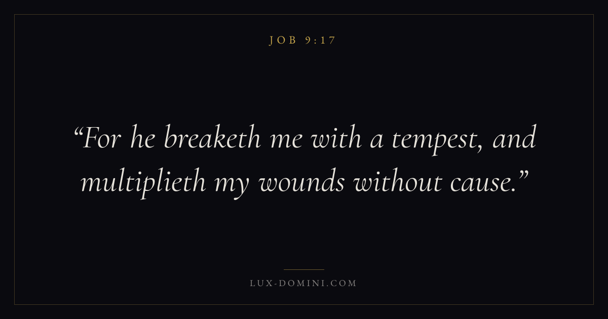 Books / Job / Chapter 9 / Verse 17 ← Job 9:16 Job 9:17 Job 9:18 → For he breaketh me with a tempest, and multiplieth my wounds without cause. Download verse card Share on Twitter Share on Facebook Pin it ✦ Key themes Suffering and trialsWisdomJustice and mercyPeaceSuffering Read with Job 9:16Romans 8:182 Corinthians 4:17Proverbs 1:7 Related topics Bible verses about suffering and trialsBible verses about wisdomBible verses about justice and mercyBible verses about peace ✦ Job Chapter 9 verses V. 1 V. 2 V. 3 V. 4 V. 5 V. 6 V. 7 V. 8 V. 9 V. 10 V. 11 V. 12 V. 13 V. 14 V. 15 V. 16 V. 17 V. 18 V. 19 V. 20 V. 21 V. 22 V. 23 V. 24 V. 25 V. 26 V. 27 V. 28 V. 29 V. 30 V. 31 V. 32 V. 33 V. 34 V. 35