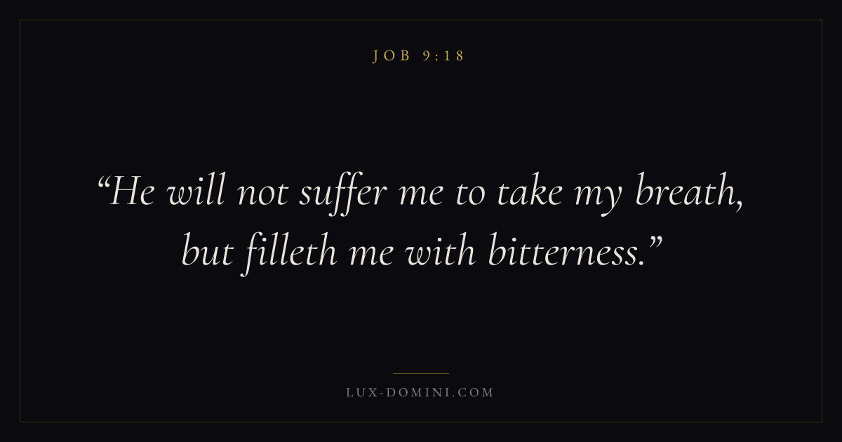Books / Job / Chapter 9 / Verse 18 ← Job 9:17 Job 9:18 Job 9:19 → He will not suffer me to take my breath, but filleth me with bitterness. Download verse card Share on Twitter Share on Facebook Pin it ✦ Key themes Suffering and trialsWisdomJustice and mercyPeaceSuffering Read with Job 9:19Romans 8:182 Corinthians 4:17Proverbs 1:7 Related topics Bible verses about suffering and trialsBible verses about wisdomBible verses about justice and mercyBible verses about peace ✦ Job Chapter 9 verses V. 1 V. 2 V. 3 V. 4 V. 5 V. 6 V. 7 V. 8 V. 9 V. 10 V. 11 V. 12 V. 13 V. 14 V. 15 V. 16 V. 17 V. 18 V. 19 V. 20 V. 21 V. 22 V. 23 V. 24 V. 25 V. 26 V. 27 V. 28 V. 29 V. 30 V. 31 V. 32 V. 33 V. 34 V. 35