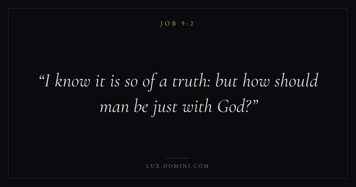 Books / Job / Chapter 9 / Verse 2 ← Job 9:1 Job 9:2 Job 9:3 → I know it is so of a truth: but how should man be just with God? Download verse card Share on Twitter Share on Facebook Pin it ✦ Key themes Suffering and trialsWisdomJustice and mercyTruthSuffering Read with Job 9:1Romans 8:182 Corinthians 4:17Proverbs 1:7 Related topics Bible verses about suffering and trialsBible verses about wisdomBible verses about justice and mercyBible verses about truth ✦ Job Chapter 9 verses V. 1 V. 2 V. 3 V. 4 V. 5 V. 6 V. 7 V. 8 V. 9 V. 10 V. 11 V. 12 V. 13 V. 14 V. 15 V. 16 V. 17 V. 18 V. 19 V. 20 V. 21 V. 22 V. 23 V. 24 V. 25 V. 26 V. 27 V. 28 V. 29 V. 30 V. 31 V. 32 V. 33 V. 34 V. 35