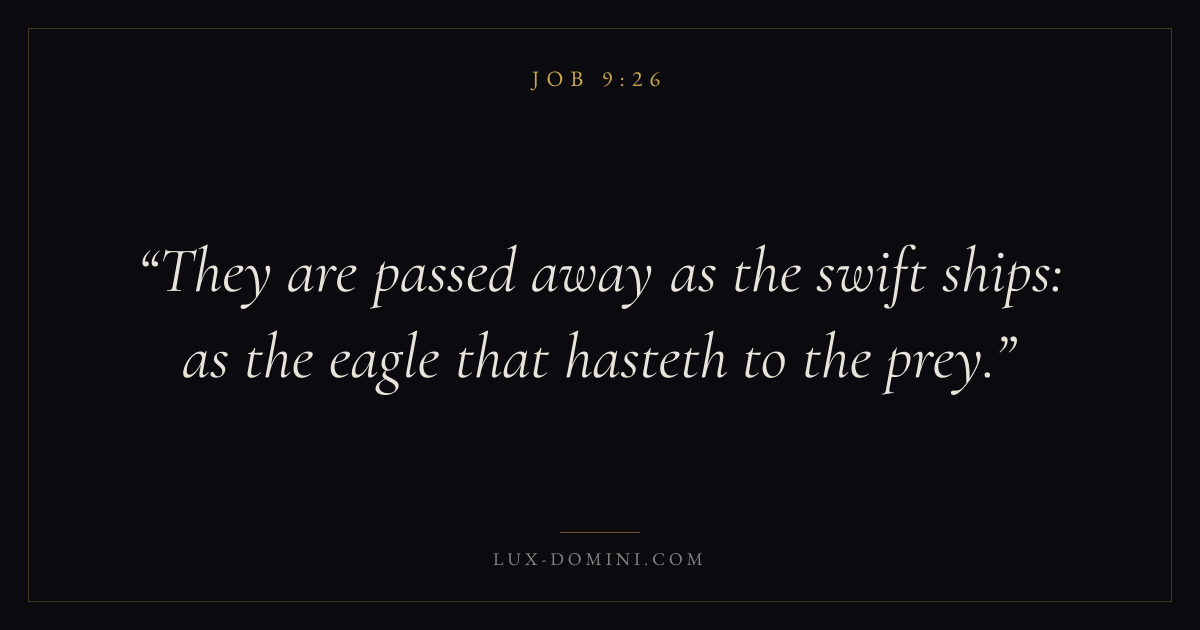 Books / Job / Chapter 9 / Verse 26 ← Job 9:25 Job 9:26 Job 9:27 → They are passed away as the swift ships: as the eagle that hasteth to the prey. Download verse card Share on Twitter Share on Facebook Pin it ✦ Key themes Suffering and trialsWisdomJustice and mercySalvationSuffering Read with Job 9:25Romans 8:182 Corinthians 4:17Proverbs 1:7 Related topics Bible verses about suffering and trialsBible verses about wisdomBible verses about justice and mercyBible verses about salvation ✦ Job Chapter 9 verses V. 1 V. 2 V. 3 V. 4 V. 5 V. 6 V. 7 V. 8 V. 9 V. 10 V. 11 V. 12 V. 13 V. 14 V. 15 V. 16 V. 17 V. 18 V. 19 V. 20 V. 21 V. 22 V. 23 V. 24 V. 25 V. 26 V. 27 V. 28 V. 29 V. 30 V. 31 V. 32 V. 33 V. 34 V. 35