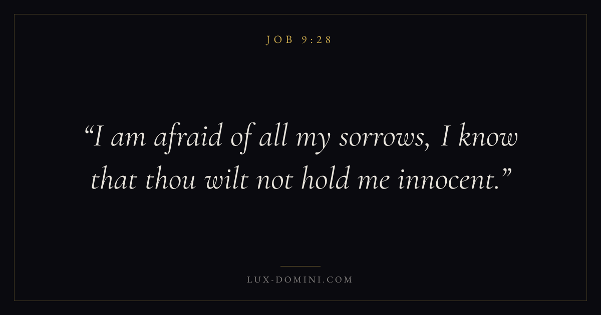 Books / Job / Chapter 9 / Verse 28 ← Job 9:27 Job 9:28 Job 9:29 → I am afraid of all my sorrows, I know that thou wilt not hold me innocent. Download verse card Share on Twitter Share on Facebook Pin it ✦ Key themes Anxiety and fearSuffering and trialsWisdomJustice and mercySuffering Read with Job 9:27Job 9:29Philippians 4:6Isaiah 41:10 Related topics Bible verses about anxiety and fearBible verses about suffering and trialsBible verses about wisdomBible verses about justice and mercy ✦ Job Chapter 9 verses V. 1 V. 2 V. 3 V. 4 V. 5 V. 6 V. 7 V. 8 V. 9 V. 10 V. 11 V. 12 V. 13 V. 14 V. 15 V. 16 V. 17 V. 18 V. 19 V. 20 V. 21 V. 22 V. 23 V. 24 V. 25 V. 26 V. 27 V. 28 V. 29 V. 30 V. 31 V. 32 V. 33 V. 34 V. 35