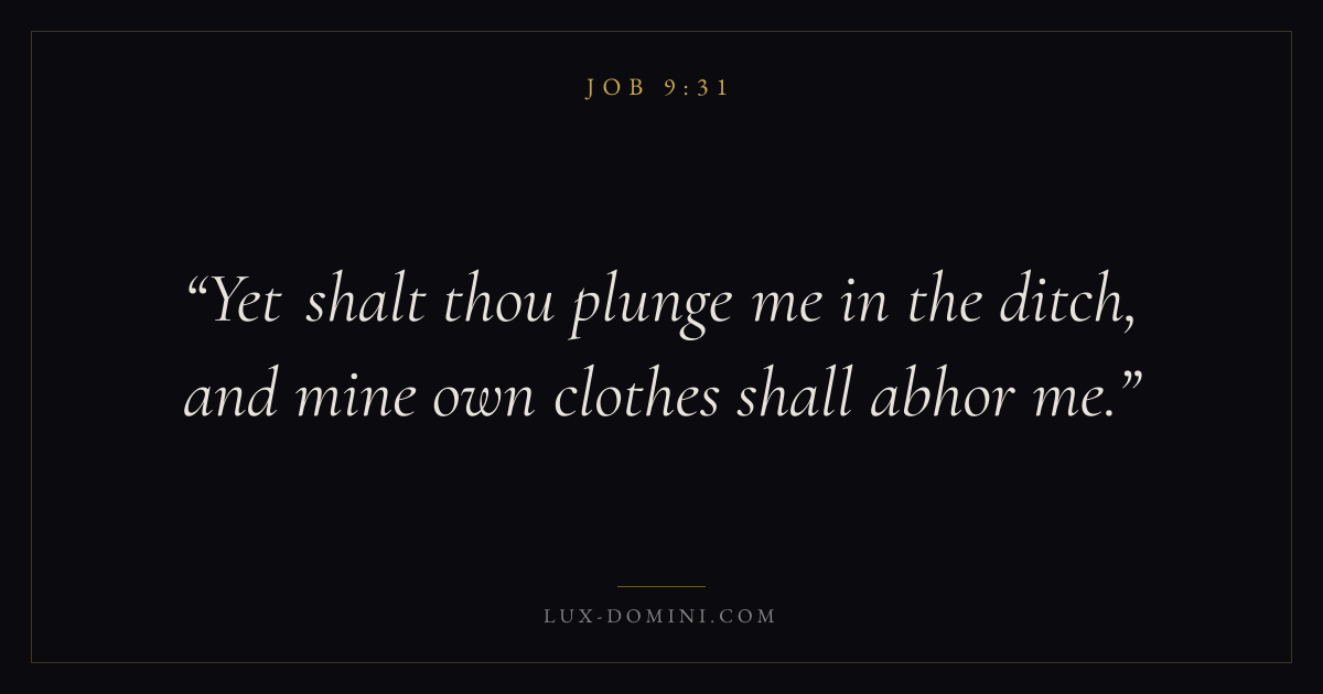 Books / Job / Chapter 9 / Verse 31 ← Job 9:30 Job 9:31 Job 9:32 → Yet shalt thou plunge me in the ditch, and mine own clothes shall abhor me. Download verse card Share on Twitter Share on Facebook Pin it ✦ Key themes Suffering and trialsWisdomJustice and mercySalvationSuffering Read with Job 9:30Job 9:32Romans 8:182 Corinthians 4:17 Related topics Bible verses about suffering and trialsBible verses about wisdomBible verses about justice and mercyBible verses about salvation ✦ Job Chapter 9 verses V. 1 V. 2 V. 3 V. 4 V. 5 V. 6 V. 7 V. 8 V. 9 V. 10 V. 11 V. 12 V. 13 V. 14 V. 15 V. 16 V. 17 V. 18 V. 19 V. 20 V. 21 V. 22 V. 23 V. 24 V. 25 V. 26 V. 27 V. 28 V. 29 V. 30 V. 31 V. 32 V. 33 V. 34 V. 35