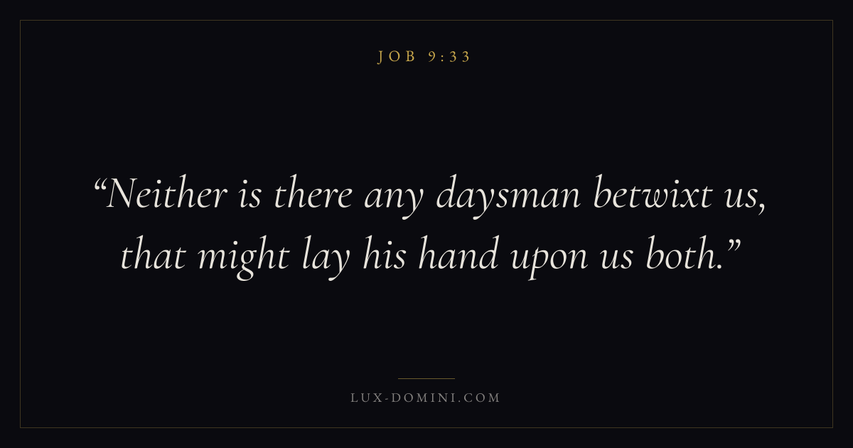 Books / Job / Chapter 9 / Verse 33 ← Job 9:32 Job 9:33 Job 9:34 → Neither is there any daysman betwixt us, that might lay his hand upon us both. Download verse card Share on Twitter Share on Facebook Pin it ✦ Key themes Suffering and trialsWisdomJustice and mercySalvationSuffering Read with Job 9:30Job 9:31Romans 8:182 Corinthians 4:17 Related topics Bible verses about suffering and trialsBible verses about wisdomBible verses about justice and mercyBible verses about salvation ✦ Job Chapter 9 verses V. 1 V. 2 V. 3 V. 4 V. 5 V. 6 V. 7 V. 8 V. 9 V. 10 V. 11 V. 12 V. 13 V. 14 V. 15 V. 16 V. 17 V. 18 V. 19 V. 20 V. 21 V. 22 V. 23 V. 24 V. 25 V. 26 V. 27 V. 28 V. 29 V. 30 V. 31 V. 32 V. 33 V. 34 V. 35