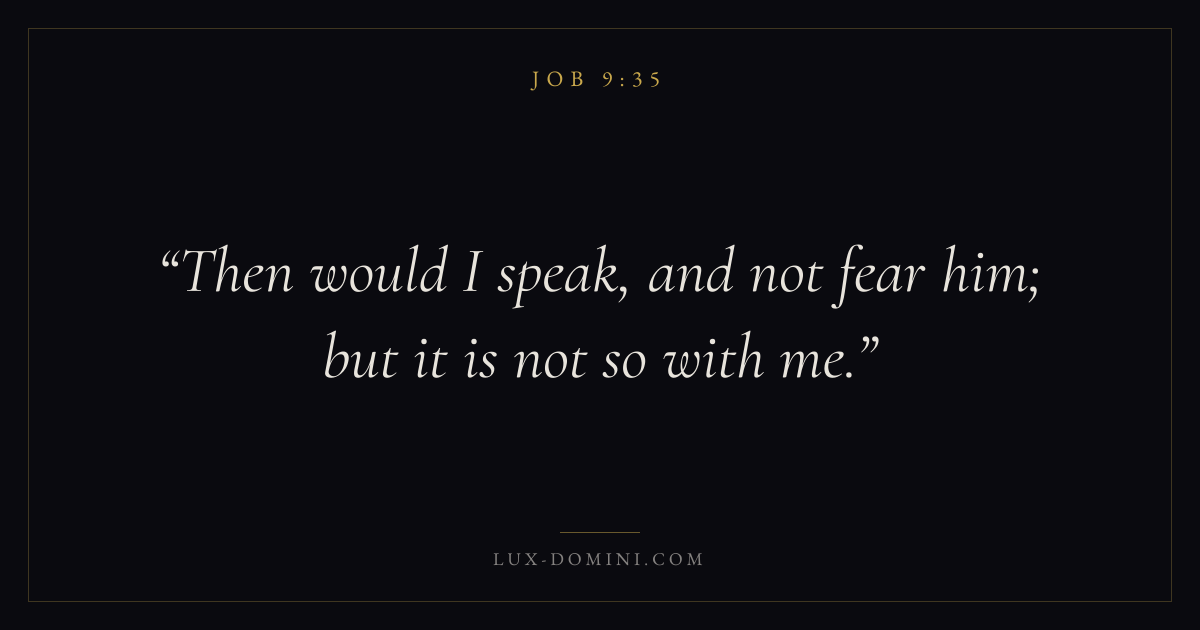 Books / Job / Chapter 9 / Verse 35 ← Job 9:34 Job 9:35 Job 10:1 → Then would I speak, and not fear him; but it is not so with me. Download verse card Share on Twitter Share on Facebook Pin it ✦ Key themes Anxiety and fearSuffering and trialsWisdomJustice and mercySuffering Read with Job 9:34Philippians 4:6Isaiah 41:10Romans 8:18 Related topics Bible verses about anxiety and fearBible verses about suffering and trialsBible verses about wisdomBible verses about justice and mercy ✦ Job Chapter 9 verses V. 1 V. 2 V. 3 V. 4 V. 5 V. 6 V. 7 V. 8 V. 9 V. 10 V. 11 V. 12 V. 13 V. 14 V. 15 V. 16 V. 17 V. 18 V. 19 V. 20 V. 21 V. 22 V. 23 V. 24 V. 25 V. 26 V. 27 V. 28 V. 29 V. 30 V. 31 V. 32 V. 33 V. 34 V. 35