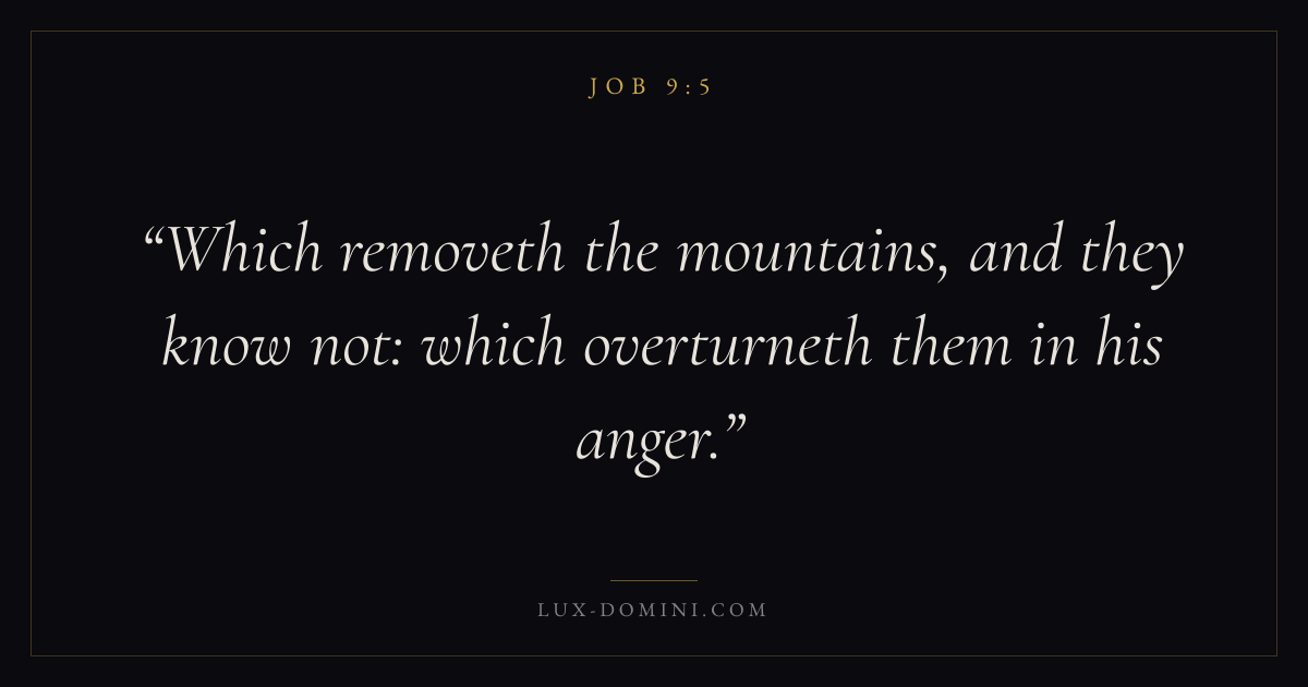 Books / Job / Chapter 9 / Verse 5 ← Job 9:4 Job 9:5 Job 9:6 → Which removeth the mountains, and they know not: which overturneth them in his anger. Download verse card Share on Twitter Share on Facebook Pin it ✦ Key themes Suffering and trialsWisdomJustice and mercySuffering Read with Job 9:6Romans 8:182 Corinthians 4:17Proverbs 1:7 Related topics Bible verses about suffering and trialsBible verses about wisdomBible verses about justice and mercy ✦ Job Chapter 9 verses V. 1 V. 2 V. 3 V. 4 V. 5 V. 6 V. 7 V. 8 V. 9 V. 10 V. 11 V. 12 V. 13 V. 14 V. 15 V. 16 V. 17 V. 18 V. 19 V. 20 V. 21 V. 22 V. 23 V. 24 V. 25 V. 26 V. 27 V. 28 V. 29 V. 30 V. 31 V. 32 V. 33 V. 34 V. 35