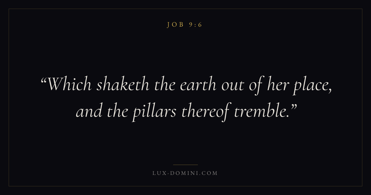 Books / Job / Chapter 9 / Verse 6 ← Job 9:5 Job 9:6 Job 9:7 → Which shaketh the earth out of her place, and the pillars thereof tremble. Download verse card Share on Twitter Share on Facebook Pin it ✦ Key themes Suffering and trialsWisdomJustice and mercySuffering Read with Job 9:5Romans 8:182 Corinthians 4:17Proverbs 1:7 Related topics Bible verses about suffering and trialsBible verses about wisdomBible verses about justice and mercy ✦ Job Chapter 9 verses V. 1 V. 2 V. 3 V. 4 V. 5 V. 6 V. 7 V. 8 V. 9 V. 10 V. 11 V. 12 V. 13 V. 14 V. 15 V. 16 V. 17 V. 18 V. 19 V. 20 V. 21 V. 22 V. 23 V. 24 V. 25 V. 26 V. 27 V. 28 V. 29 V. 30 V. 31 V. 32 V. 33 V. 34 V. 35