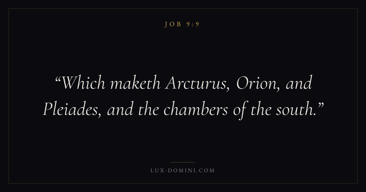 Books / Job / Chapter 9 / Verse 9 ← Job 9:8 Job 9:9 Job 9:10 → Which maketh Arcturus, Orion, and Pleiades, and the chambers of the south. Download verse card Share on Twitter Share on Facebook Pin it ✦ Key themes Suffering and trialsWisdomJustice and mercySuffering Read with Job 9:10Romans 8:182 Corinthians 4:17Proverbs 1:7 Related topics Bible verses about suffering and trialsBible verses about wisdomBible verses about justice and mercy ✦ Job Chapter 9 verses V. 1 V. 2 V. 3 V. 4 V. 5 V. 6 V. 7 V. 8 V. 9 V. 10 V. 11 V. 12 V. 13 V. 14 V. 15 V. 16 V. 17 V. 18 V. 19 V. 20 V. 21 V. 22 V. 23 V. 24 V. 25 V. 26 V. 27 V. 28 V. 29 V. 30 V. 31 V. 32 V. 33 V. 34 V. 35