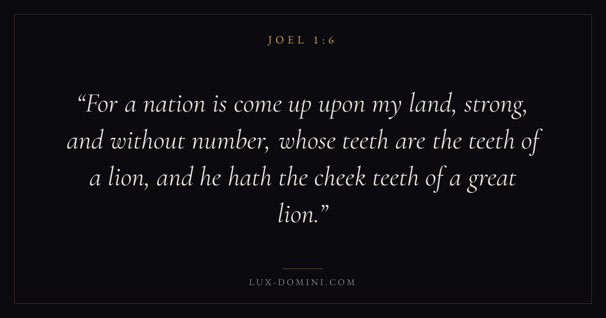 For a nation is come up upon my land, strong, and without number, whose teeth are the teeth of a lion, and he hath the cheek teeth of a great lion.