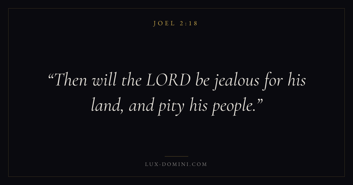 Books / Joel / Chapter 2 / Verse 18 ← Joel 2:17 Joel 2:18 Joel 2:19 → Then will the LORD be jealous for his land, and pity his people. Download verse card Share on Twitter Share on Facebook Pin it ✦ Key themes PrayerJustice and mercyRepentanceDay of the Lord Read with Joel 2:19Joel 2:20Matthew 6:9Luke 18:1 Related topics Bible verses about prayerBible verses about justice and mercyBible verses about repentance ✦ Joel Chapter 2 verses V. 1 V. 2 V. 3 V. 4 V. 5 V. 6 V. 7 V. 8 V. 9 V. 10 V. 11 V. 12 V. 13 V. 14 V. 15 V. 16 V. 17 V. 18 V. 19 V. 20 V. 21 V. 22 V. 23 V. 24 V. 25 V. 26 V. 27 V. 28 V. 29 V. 30 V. 31 V. 32