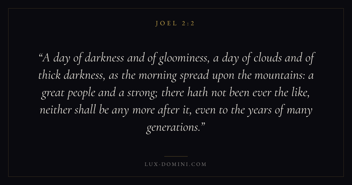A day of darkness and of gloominess, a day of clouds and of thick darkness, as the morning spread upon the mountains: a great people and a strong; there hath not been ever the like, neither shall be any more after it, even to the years of many generations.