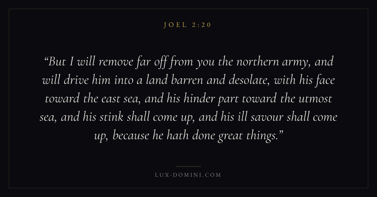 But I will remove far off from you the northern army, and will drive him into a land barren and desolate, with his face toward the east sea, and his hinder part toward the utmost sea, and his stink shall come up, and his ill savour shall come up, because he hath done great things.