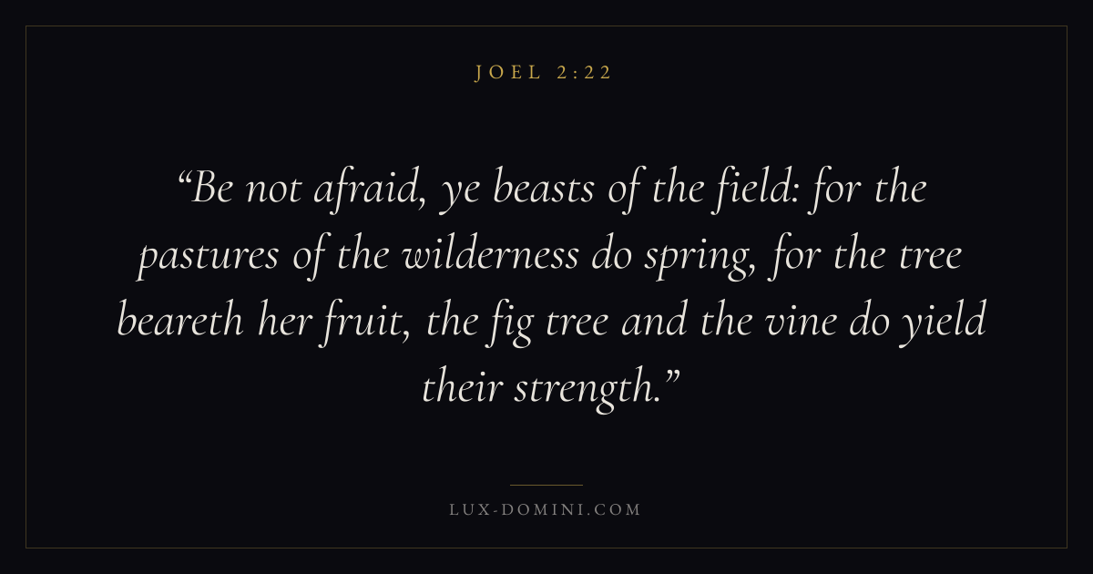 Be not afraid, ye beasts of the field: for the pastures of the wilderness do spring, for the tree beareth her fruit, the fig tree and the vine do yield their strength.