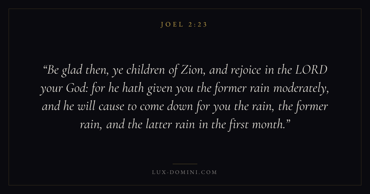 Be glad then, ye children of Zion, and rejoice in the LORD your God: for he hath given you the former rain moderately, and he will cause to come down for you the rain, the former rain, and the latter rain in the first month.