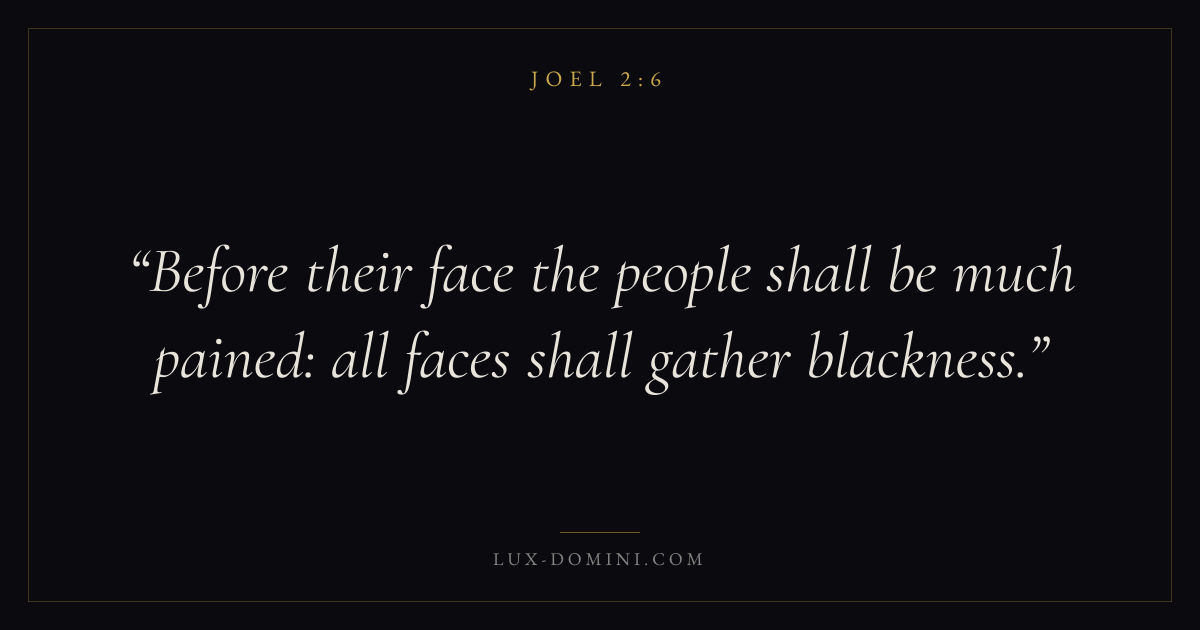 Books / Joel / Chapter 2 / Verse 6 ← Joel 2:5 Joel 2:6 Joel 2:7 → Before their face the people shall be much pained: all faces shall gather blackness. Download verse card Share on Twitter Share on Facebook Pin it ✦ Key themes Justice and mercyRepentanceDay of the LordSpirit Read with Joel 2:5Micah 6:8Amos 5:24 Related topics Bible verses about justice and mercyBible verses about repentance ✦ Joel Chapter 2 verses V. 1 V. 2 V. 3 V. 4 V. 5 V. 6 V. 7 V. 8 V. 9 V. 10 V. 11 V. 12 V. 13 V. 14 V. 15 V. 16 V. 17 V. 18 V. 19 V. 20 V. 21 V. 22 V. 23 V. 24 V. 25 V. 26 V. 27 V. 28 V. 29 V. 30 V. 31 V. 32