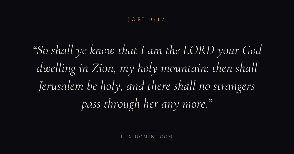 So shall ye know that I am the LORD your God dwelling in Zion, my holy mountain: then shall Jerusalem be holy, and there shall no strangers pass through her any more.