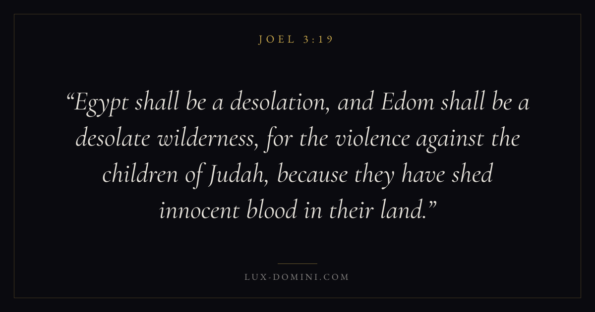 Egypt shall be a desolation, and Edom shall be a desolate wilderness, for the violence against the children of Judah, because they have shed innocent blood in their land.