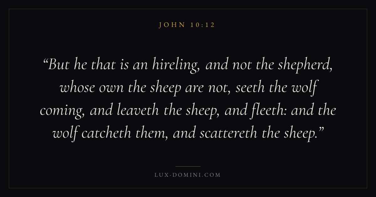 But he that is an hireling, and not the shepherd, whose own the sheep are not, seeth the wolf coming, and leaveth the sheep, and fleeth: and the wolf catcheth them, and scattereth the sheep.