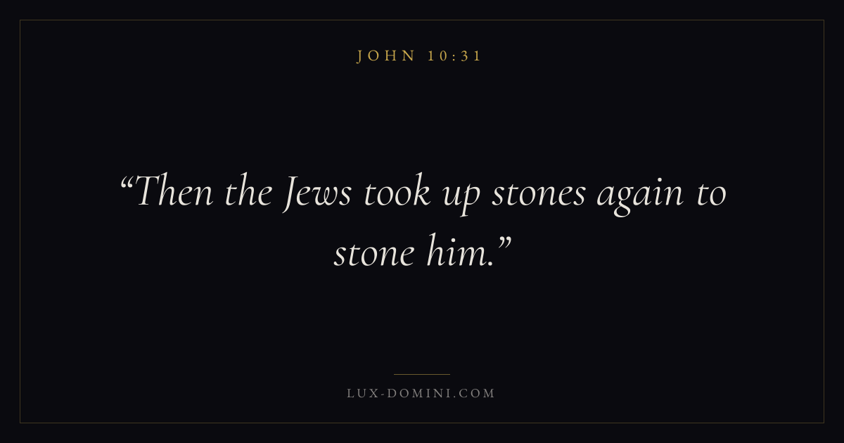 Books / John / Chapter 10 / Verse 31 ← John 10:30 John 10:31 John 10:32 → Then the Jews took up stones again to stone him. Download verse card Share on Twitter Share on Facebook Pin it ✦ Key themes LoveFaithJustice and mercyTruthIncarnation Read with John 10:30John 3:161 Corinthians 13:4Hebrews 11:1 Related topics Bible verses about loveBible verses about faithBible verses about justice and mercyBible verses about truth ✦ John Chapter 10 verses V. 1 V. 2 V. 3 V. 4 V. 5 V. 6 V. 7 V. 8 V. 9 V. 10 V. 11 V. 12 V. 13 V. 14 V. 15 V. 16 V. 17 V. 18 V. 19 V. 20 V. 21 V. 22 V. 23 V. 24 V. 25 V. 26 V. 27 V. 28 V. 29 V. 30 V. 31 V. 32 V. 33 V. 34 V. 35 V. 36 V. 37 V. 38 V. 39 V. 40 V. 41 V. 42