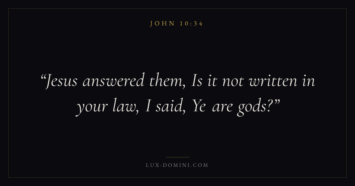 Books / John / Chapter 10 / Verse 34 ← John 10:33 John 10:34 John 10:35 → Jesus answered them, Is it not written in your law, I said, Ye are gods? Download verse card Share on Twitter Share on Facebook Pin it ✦ Key themes LoveFaithJustice and mercyTruthIncarnation Read with John 10:32John 10:33John 3:161 Corinthians 13:4 Related topics Bible verses about loveBible verses about faithBible verses about justice and mercyBible verses about truth ✦ John Chapter 10 verses V. 1 V. 2 V. 3 V. 4 V. 5 V. 6 V. 7 V. 8 V. 9 V. 10 V. 11 V. 12 V. 13 V. 14 V. 15 V. 16 V. 17 V. 18 V. 19 V. 20 V. 21 V. 22 V. 23 V. 24 V. 25 V. 26 V. 27 V. 28 V. 29 V. 30 V. 31 V. 32 V. 33 V. 34 V. 35 V. 36 V. 37 V. 38 V. 39 V. 40 V. 41 V. 42