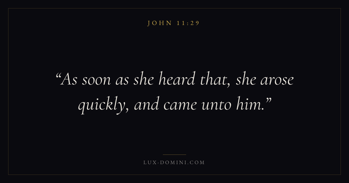 Books / John / Chapter 11 / Verse 29 ← John 11:28 John 11:29 John 11:30 → As soon as she heard that, she arose quickly, and came unto him. Download verse card Share on Twitter Share on Facebook Pin it ✦ Key themes LoveFaithAnxiety and fearGraceIncarnation Read with John 11:30John 3:161 Corinthians 13:4Hebrews 11:1 Related topics Bible verses about loveBible verses about faithBible verses about anxiety and fearBible verses about grace ✦ John Chapter 11 verses V. 1 V. 2 V. 3 V. 4 V. 5 V. 6 V. 7 V. 8 V. 9 V. 10 V. 11 V. 12 V. 13 V. 14 V. 15 V. 16 V. 17 V. 18 V. 19 V. 20 V. 21 V. 22 V. 23 V. 24 V. 25 V. 26 V. 27 V. 28 V. 29 V. 30 V. 31 V. 32 V. 33 V. 34 V. 35 V. 36 V. 37 V. 38 V. 39 V. 40 V. 41 V. 42 V. 43 V. 44 V. 45 V. 46 V. 47 V. 48 V. 49 V. 50 V. 51 V. 52 V. 53 V. 54 V. 55 V. 56 V. 57