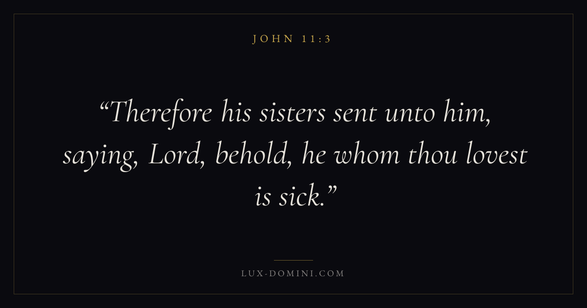 Books / John / Chapter 11 / Verse 3 ← John 11:2 John 11:3 John 11:4 → Therefore his sisters sent unto him, saying, Lord, behold, he whom thou lovest is sick. Download verse card Share on Twitter Share on Facebook Pin it ✦ Key themes LoveFaithTruthIncarnation Read with John 11:1John 11:2John 3:161 Corinthians 13:4 Related topics Bible verses about loveBible verses about faithBible verses about truth ✦ John Chapter 11 verses V. 1 V. 2 V. 3 V. 4 V. 5 V. 6 V. 7 V. 8 V. 9 V. 10 V. 11 V. 12 V. 13 V. 14 V. 15 V. 16 V. 17 V. 18 V. 19 V. 20 V. 21 V. 22 V. 23 V. 24 V. 25 V. 26 V. 27 V. 28 V. 29 V. 30 V. 31 V. 32 V. 33 V. 34 V. 35 V. 36 V. 37 V. 38 V. 39 V. 40 V. 41 V. 42 V. 43 V. 44 V. 45 V. 46 V. 47 V. 48 V. 49 V. 50 V. 51 V. 52 V. 53 V. 54 V. 55 V. 56 V. 57