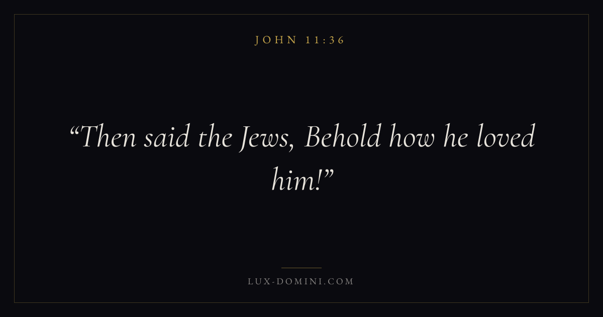 Books / John / Chapter 11 / Verse 36 ← John 11:35 John 11:36 John 11:37 → Then said the Jews, Behold how he loved him! Download verse card Share on Twitter Share on Facebook Pin it ✦ Key themes LoveFaithSuffering and trialsTruthIncarnation Read with John 11:35John 11:37John 3:161 Corinthians 13:4 Related topics Bible verses about loveBible verses about faithBible verses about suffering and trialsBible verses about truth ✦ John Chapter 11 verses V. 1 V. 2 V. 3 V. 4 V. 5 V. 6 V. 7 V. 8 V. 9 V. 10 V. 11 V. 12 V. 13 V. 14 V. 15 V. 16 V. 17 V. 18 V. 19 V. 20 V. 21 V. 22 V. 23 V. 24 V. 25 V. 26 V. 27 V. 28 V. 29 V. 30 V. 31 V. 32 V. 33 V. 34 V. 35 V. 36 V. 37 V. 38 V. 39 V. 40 V. 41 V. 42 V. 43 V. 44 V. 45 V. 46 V. 47 V. 48 V. 49 V. 50 V. 51 V. 52 V. 53 V. 54 V. 55 V. 56 V. 57
