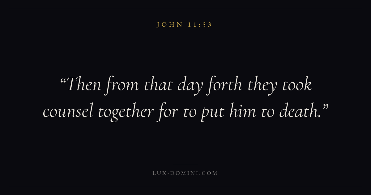 Books / John / Chapter 11 / Verse 53 ← John 11:52 John 11:53 John 11:54 → Then from that day forth they took counsel together for to put him to death. Download verse card Share on Twitter Share on Facebook Pin it ✦ Key themes LoveFaithGraceTruthIncarnation Read with John 11:54John 3:161 Corinthians 13:4Hebrews 11:1 Related topics Bible verses about loveBible verses about faithBible verses about graceBible verses about truth ✦ John Chapter 11 verses V. 1 V. 2 V. 3 V. 4 V. 5 V. 6 V. 7 V. 8 V. 9 V. 10 V. 11 V. 12 V. 13 V. 14 V. 15 V. 16 V. 17 V. 18 V. 19 V. 20 V. 21 V. 22 V. 23 V. 24 V. 25 V. 26 V. 27 V. 28 V. 29 V. 30 V. 31 V. 32 V. 33 V. 34 V. 35 V. 36 V. 37 V. 38 V. 39 V. 40 V. 41 V. 42 V. 43 V. 44 V. 45 V. 46 V. 47 V. 48 V. 49 V. 50 V. 51 V. 52 V. 53 V. 54 V. 55 V. 56 V. 57