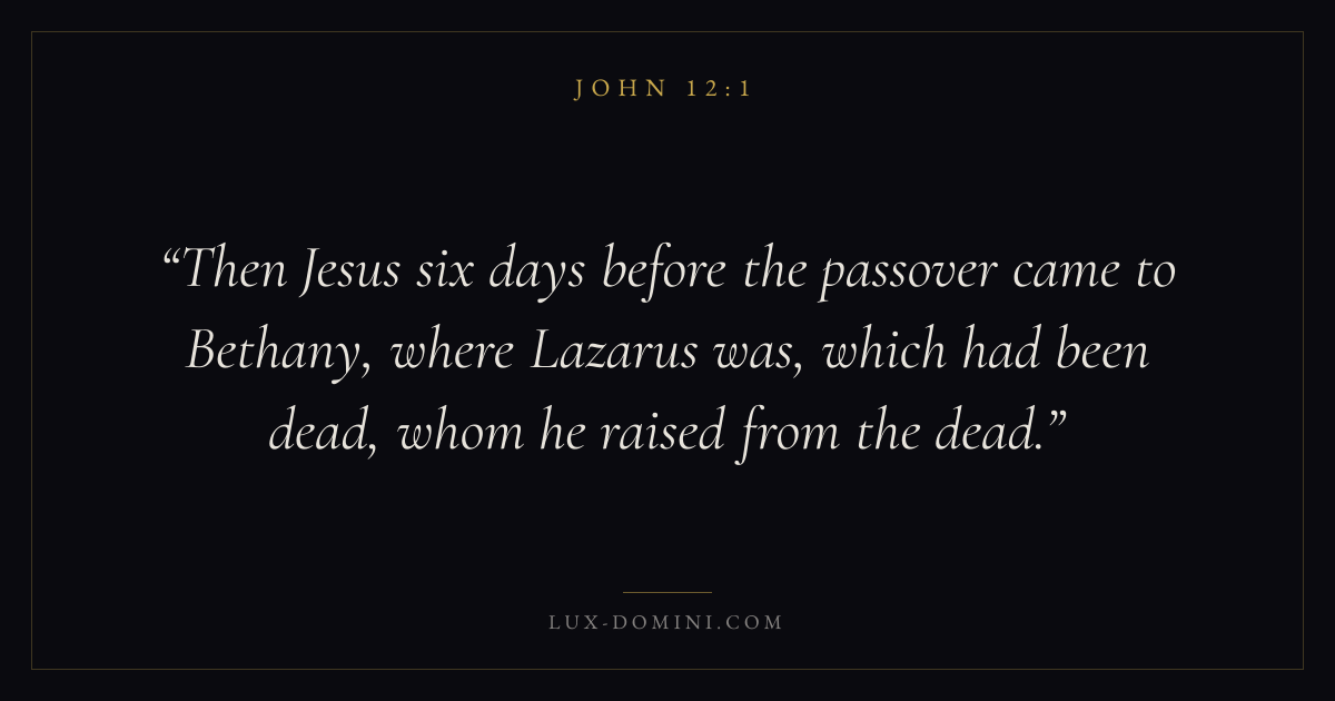 Then Jesus six days before the passover came to Bethany, where Lazarus was, which had been dead, whom he raised from the dead.