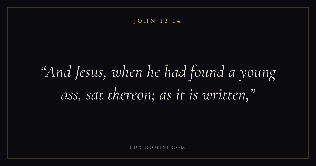 Books / John / Chapter 12 / Verse 14 ← John 12:13 John 12:14 John 12:15 → And Jesus, when he had found a young ass, sat thereon; as it is written, Download verse card Share on Twitter Share on Facebook Pin it ✦ Key themes LoveFaithTruthIncarnation Read with John 12:12John 12:13John 3:161 Corinthians 13:4 Related topics Bible verses about loveBible verses about faithBible verses about truth ✦ John Chapter 12 verses V. 1 V. 2 V. 3 V. 4 V. 5 V. 6 V. 7 V. 8 V. 9 V. 10 V. 11 V. 12 V. 13 V. 14 V. 15 V. 16 V. 17 V. 18 V. 19 V. 20 V. 21 V. 22 V. 23 V. 24 V. 25 V. 26 V. 27 V. 28 V. 29 V. 30 V. 31 V. 32 V. 33 V. 34 V. 35 V. 36 V. 37 V. 38 V. 39 V. 40 V. 41 V. 42 V. 43 V. 44 V. 45 V. 46 V. 47 V. 48 V. 49 V. 50