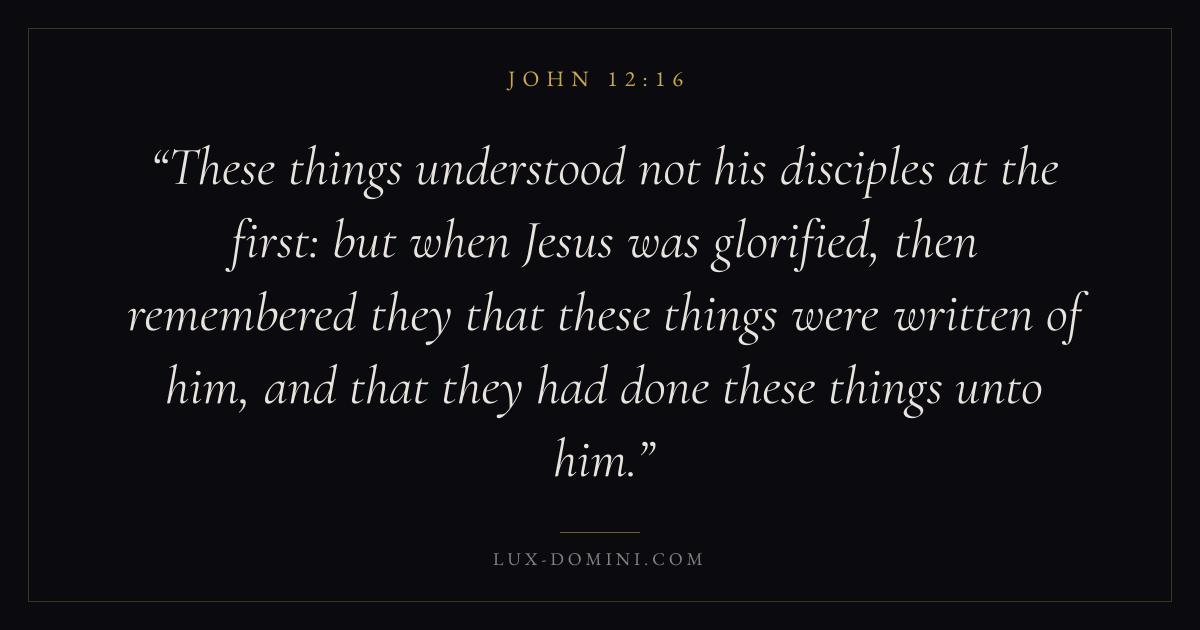 These things understood not his disciples at the first: but when Jesus was glorified, then remembered they that these things were written of him, and that they had done these things unto him.