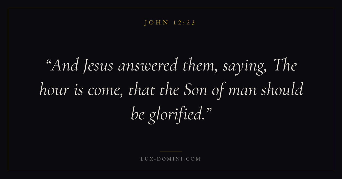 Books / John / Chapter 12 / Verse 23 ← John 12:22 John 12:23 John 12:24 → And Jesus answered them, saying, The hour is come, that the Son of man should be glorified. Download verse card Share on Twitter Share on Facebook Pin it ✦ Key themes LoveFaithGraceTruthIncarnation Read with John 12:24John 12:25John 3:161 Corinthians 13:4 Related topics Bible verses about loveBible verses about faithBible verses about graceBible verses about truth ✦ John Chapter 12 verses V. 1 V. 2 V. 3 V. 4 V. 5 V. 6 V. 7 V. 8 V. 9 V. 10 V. 11 V. 12 V. 13 V. 14 V. 15 V. 16 V. 17 V. 18 V. 19 V. 20 V. 21 V. 22 V. 23 V. 24 V. 25 V. 26 V. 27 V. 28 V. 29 V. 30 V. 31 V. 32 V. 33 V. 34 V. 35 V. 36 V. 37 V. 38 V. 39 V. 40 V. 41 V. 42 V. 43 V. 44 V. 45 V. 46 V. 47 V. 48 V. 49 V. 50