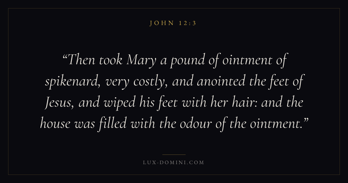 Then took Mary a pound of ointment of spikenard, very costly, and anointed the feet of Jesus, and wiped his feet with her hair: and the house was filled with the odour of the ointment.