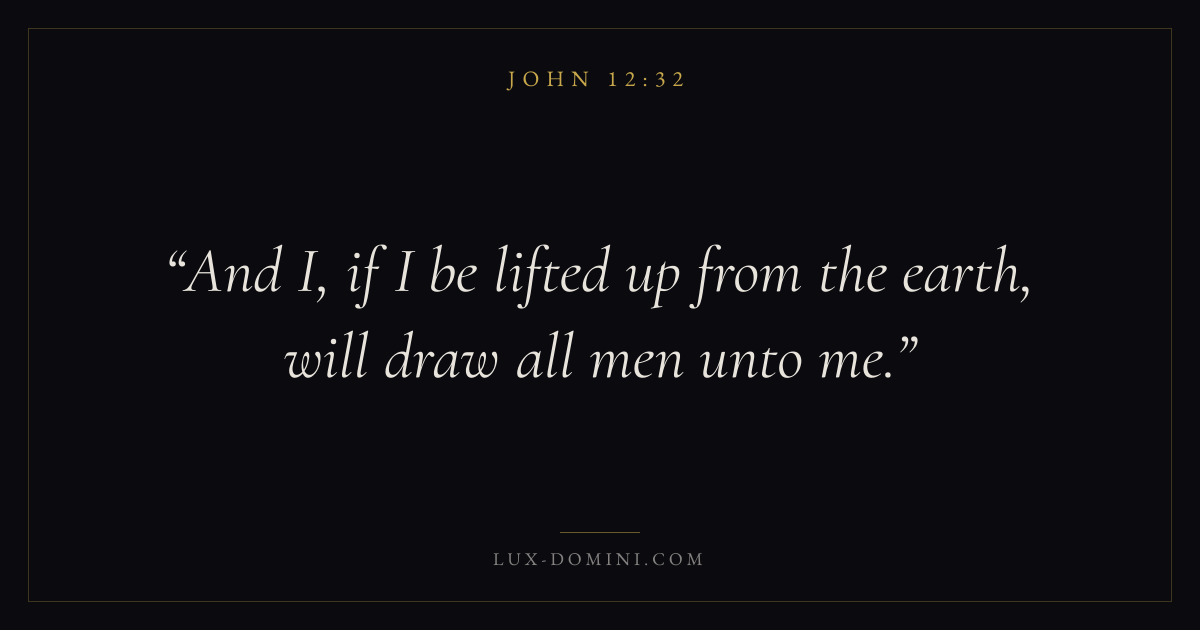 Books / John / Chapter 12 / Verse 32 ← John 12:31 John 12:32 John 12:33 → And I, if I be lifted up from the earth, will draw all men unto me. Download verse card Share on Twitter Share on Facebook Pin it ✦ Key themes LoveFaithAnxiety and fearSuffering and trialsIncarnation Read with John 12:30John 12:31John 3:161 Corinthians 13:4 Related topics Bible verses about loveBible verses about faithBible verses about anxiety and fearBible verses about suffering and trials ✦ John Chapter 12 verses V. 1 V. 2 V. 3 V. 4 V. 5 V. 6 V. 7 V. 8 V. 9 V. 10 V. 11 V. 12 V. 13 V. 14 V. 15 V. 16 V. 17 V. 18 V. 19 V. 20 V. 21 V. 22 V. 23 V. 24 V. 25 V. 26 V. 27 V. 28 V. 29 V. 30 V. 31 V. 32 V. 33 V. 34 V. 35 V. 36 V. 37 V. 38 V. 39 V. 40 V. 41 V. 42 V. 43 V. 44 V. 45 V. 46 V. 47 V. 48 V. 49 V. 50