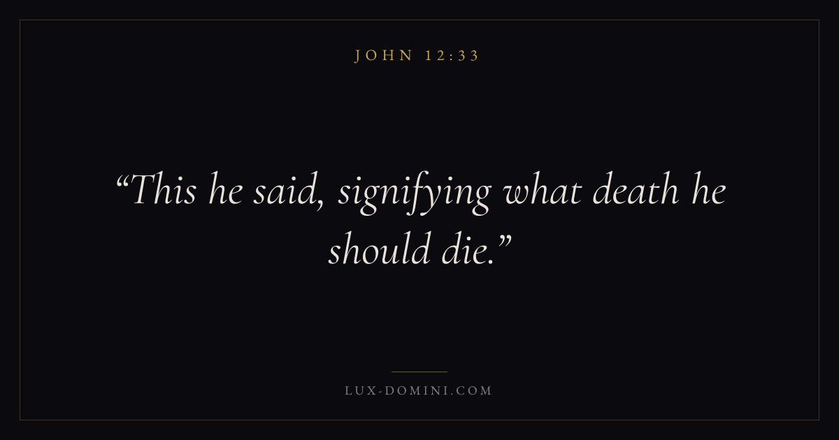 Books / John / Chapter 12 / Verse 33 ← John 12:32 John 12:33 John 12:34 → This he said, signifying what death he should die. Download verse card Share on Twitter Share on Facebook Pin it ✦ Key themes LoveFaithAnxiety and fearSuffering and trialsIncarnation Read with John 12:34John 12:35John 3:161 Corinthians 13:4 Related topics Bible verses about loveBible verses about faithBible verses about anxiety and fearBible verses about suffering and trials ✦ John Chapter 12 verses V. 1 V. 2 V. 3 V. 4 V. 5 V. 6 V. 7 V. 8 V. 9 V. 10 V. 11 V. 12 V. 13 V. 14 V. 15 V. 16 V. 17 V. 18 V. 19 V. 20 V. 21 V. 22 V. 23 V. 24 V. 25 V. 26 V. 27 V. 28 V. 29 V. 30 V. 31 V. 32 V. 33 V. 34 V. 35 V. 36 V. 37 V. 38 V. 39 V. 40 V. 41 V. 42 V. 43 V. 44 V. 45 V. 46 V. 47 V. 48 V. 49 V. 50