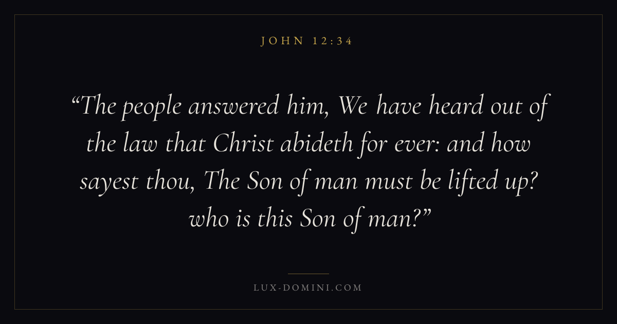 The people answered him, We have heard out of the law that Christ abideth for ever: and how sayest thou, The Son of man must be lifted up? who is this Son of man?