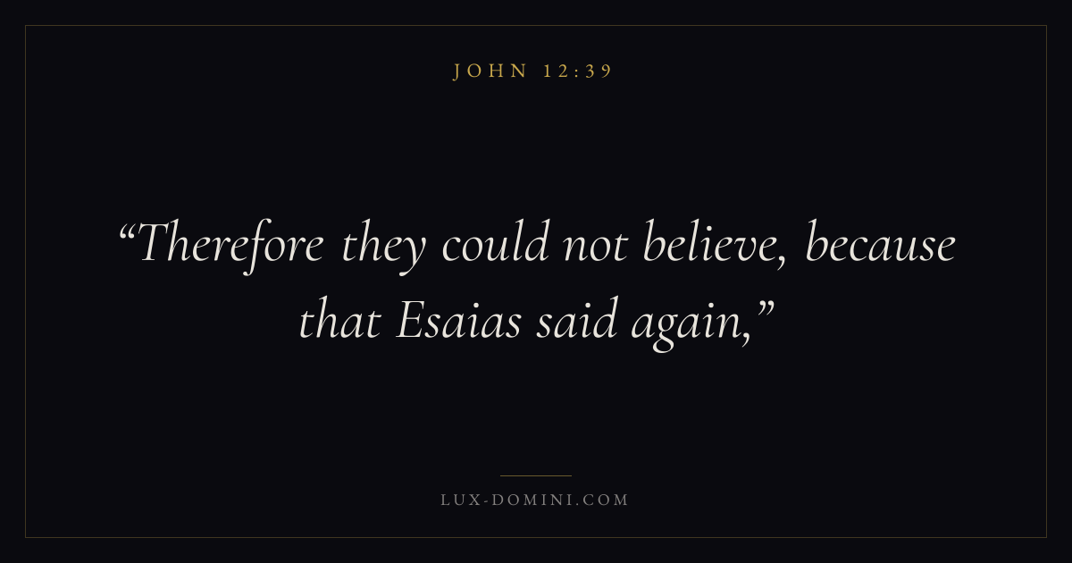Books / John / Chapter 12 / Verse 39 ← John 12:38 John 12:39 John 12:40 → Therefore they could not believe, because that Esaias said again, Download verse card Share on Twitter Share on Facebook Pin it ✦ Key themes LoveFaithWisdomTruthIncarnation Read with John 12:37John 12:38John 3:161 Corinthians 13:4 Related topics Bible verses about loveBible verses about faithBible verses about wisdomBible verses about truth ✦ John Chapter 12 verses V. 1 V. 2 V. 3 V. 4 V. 5 V. 6 V. 7 V. 8 V. 9 V. 10 V. 11 V. 12 V. 13 V. 14 V. 15 V. 16 V. 17 V. 18 V. 19 V. 20 V. 21 V. 22 V. 23 V. 24 V. 25 V. 26 V. 27 V. 28 V. 29 V. 30 V. 31 V. 32 V. 33 V. 34 V. 35 V. 36 V. 37 V. 38 V. 39 V. 40 V. 41 V. 42 V. 43 V. 44 V. 45 V. 46 V. 47 V. 48 V. 49 V. 50