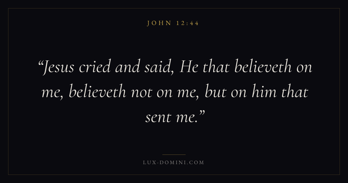 Books / John / Chapter 12 / Verse 44 ← John 12:43 John 12:44 John 12:45 → Jesus cried and said, He that believeth on me, believeth not on me, but on him that sent me. Download verse card Share on Twitter Share on Facebook Pin it ✦ Key themes LoveFaithTruthIncarnation Read with John 12:45John 3:161 Corinthians 13:4Hebrews 11:1 Related topics Bible verses about loveBible verses about faithBible verses about truth ✦ John Chapter 12 verses V. 1 V. 2 V. 3 V. 4 V. 5 V. 6 V. 7 V. 8 V. 9 V. 10 V. 11 V. 12 V. 13 V. 14 V. 15 V. 16 V. 17 V. 18 V. 19 V. 20 V. 21 V. 22 V. 23 V. 24 V. 25 V. 26 V. 27 V. 28 V. 29 V. 30 V. 31 V. 32 V. 33 V. 34 V. 35 V. 36 V. 37 V. 38 V. 39 V. 40 V. 41 V. 42 V. 43 V. 44 V. 45 V. 46 V. 47 V. 48 V. 49 V. 50