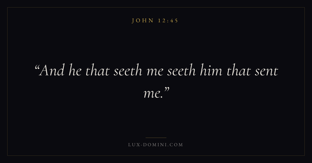 Books / John / Chapter 12 / Verse 45 ← John 12:44 John 12:45 John 12:46 → And he that seeth me seeth him that sent me. Download verse card Share on Twitter Share on Facebook Pin it ✦ Key themes LoveFaithTruthIncarnation Read with John 12:44John 3:161 Corinthians 13:4Hebrews 11:1 Related topics Bible verses about loveBible verses about faithBible verses about truth ✦ John Chapter 12 verses V. 1 V. 2 V. 3 V. 4 V. 5 V. 6 V. 7 V. 8 V. 9 V. 10 V. 11 V. 12 V. 13 V. 14 V. 15 V. 16 V. 17 V. 18 V. 19 V. 20 V. 21 V. 22 V. 23 V. 24 V. 25 V. 26 V. 27 V. 28 V. 29 V. 30 V. 31 V. 32 V. 33 V. 34 V. 35 V. 36 V. 37 V. 38 V. 39 V. 40 V. 41 V. 42 V. 43 V. 44 V. 45 V. 46 V. 47 V. 48 V. 49 V. 50