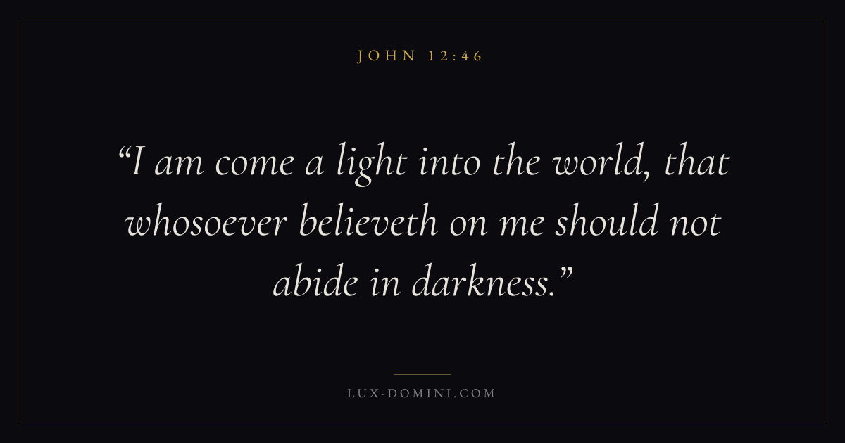 Books / John / Chapter 12 / Verse 46 ← John 12:45 John 12:46 John 12:47 → I am come a light into the world, that whosoever believeth on me should not abide in darkness. Download verse card Share on Twitter Share on Facebook Pin it ✦ Key themes LoveFaithTruthIncarnation Read with John 12:47John 3:161 Corinthians 13:4Hebrews 11:1 Related topics Bible verses about loveBible verses about faithBible verses about truth ✦ John Chapter 12 verses V. 1 V. 2 V. 3 V. 4 V. 5 V. 6 V. 7 V. 8 V. 9 V. 10 V. 11 V. 12 V. 13 V. 14 V. 15 V. 16 V. 17 V. 18 V. 19 V. 20 V. 21 V. 22 V. 23 V. 24 V. 25 V. 26 V. 27 V. 28 V. 29 V. 30 V. 31 V. 32 V. 33 V. 34 V. 35 V. 36 V. 37 V. 38 V. 39 V. 40 V. 41 V. 42 V. 43 V. 44 V. 45 V. 46 V. 47 V. 48 V. 49 V. 50