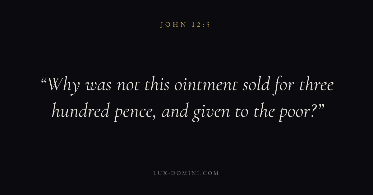 Books / John / Chapter 12 / Verse 5 ← John 12:4 John 12:5 John 12:6 → Why was not this ointment sold for three hundred pence, and given to the poor? Download verse card Share on Twitter Share on Facebook Pin it ✦ Key themes LoveFaithAnxiety and fearJustice and mercyIncarnation Read with John 12:1John 12:2John 3:161 Corinthians 13:4 Related topics Bible verses about loveBible verses about faithBible verses about anxiety and fearBible verses about justice and mercy ✦ John Chapter 12 verses V. 1 V. 2 V. 3 V. 4 V. 5 V. 6 V. 7 V. 8 V. 9 V. 10 V. 11 V. 12 V. 13 V. 14 V. 15 V. 16 V. 17 V. 18 V. 19 V. 20 V. 21 V. 22 V. 23 V. 24 V. 25 V. 26 V. 27 V. 28 V. 29 V. 30 V. 31 V. 32 V. 33 V. 34 V. 35 V. 36 V. 37 V. 38 V. 39 V. 40 V. 41 V. 42 V. 43 V. 44 V. 45 V. 46 V. 47 V. 48 V. 49 V. 50