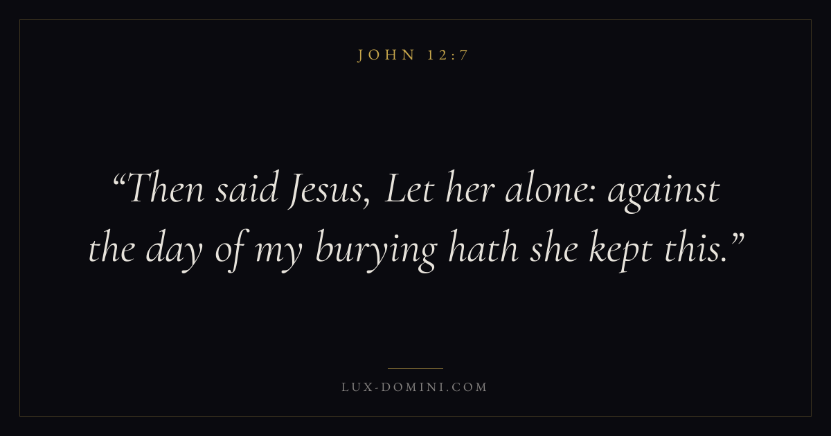 Books / John / Chapter 12 / Verse 7 ← John 12:6 John 12:7 John 12:8 → Then said Jesus, Let her alone: against the day of my burying hath she kept this. Download verse card Share on Twitter Share on Facebook Pin it ✦ Key themes LoveFaithAnxiety and fearPeaceIncarnation Read with John 12:6John 12:8John 3:161 Corinthians 13:4 Related topics Bible verses about loveBible verses about faithBible verses about anxiety and fearBible verses about peace ✦ John Chapter 12 verses V. 1 V. 2 V. 3 V. 4 V. 5 V. 6 V. 7 V. 8 V. 9 V. 10 V. 11 V. 12 V. 13 V. 14 V. 15 V. 16 V. 17 V. 18 V. 19 V. 20 V. 21 V. 22 V. 23 V. 24 V. 25 V. 26 V. 27 V. 28 V. 29 V. 30 V. 31 V. 32 V. 33 V. 34 V. 35 V. 36 V. 37 V. 38 V. 39 V. 40 V. 41 V. 42 V. 43 V. 44 V. 45 V. 46 V. 47 V. 48 V. 49 V. 50
