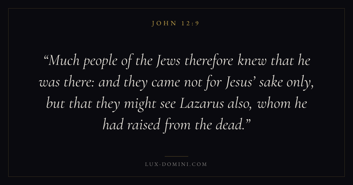 Much people of the Jews therefore knew that he was there: and they came not for Jesus’ sake only, but that they might see Lazarus also, whom he had raised from the dead.
