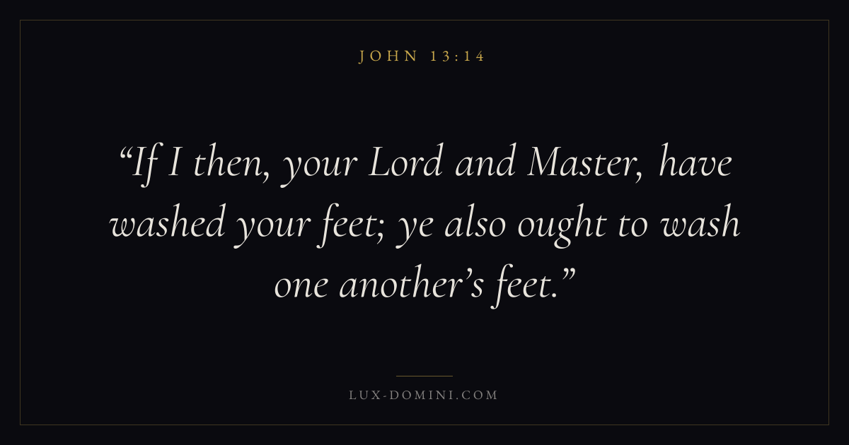 Books / John / Chapter 13 / Verse 14 ← John 13:13 John 13:14 John 13:15 → If I then, your Lord and Master, have washed your feet; ye also ought to wash one another’s feet. Download verse card Share on Twitter Share on Facebook Pin it ✦ Key themes LoveFaithTruthIncarnation Read with John 13:13John 13:15John 3:161 Corinthians 13:4 Related topics Bible verses about loveBible verses about faithBible verses about truth ✦ John Chapter 13 verses V. 1 V. 2 V. 3 V. 4 V. 5 V. 6 V. 7 V. 8 V. 9 V. 10 V. 11 V. 12 V. 13 V. 14 V. 15 V. 16 V. 17 V. 18 V. 19 V. 20 V. 21 V. 22 V. 23 V. 24 V. 25 V. 26 V. 27 V. 28 V. 29 V. 30 V. 31 V. 32 V. 33 V. 34 V. 35 V. 36 V. 37 V. 38
