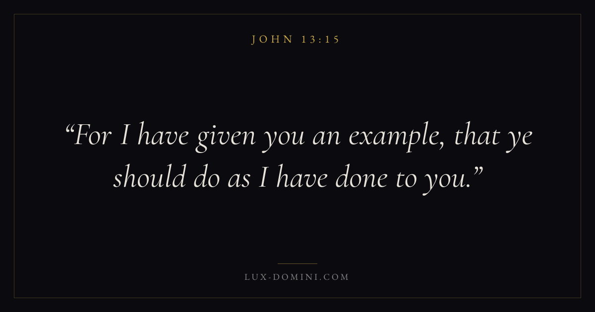 Books / John / Chapter 13 / Verse 15 ← John 13:14 John 13:15 John 13:16 → For I have given you an example, that ye should do as I have done to you. Download verse card Share on Twitter Share on Facebook Pin it ✦ Key themes LoveFaithTruthIncarnation Read with John 13:13John 13:14John 3:161 Corinthians 13:4 Related topics Bible verses about loveBible verses about faithBible verses about truth ✦ John Chapter 13 verses V. 1 V. 2 V. 3 V. 4 V. 5 V. 6 V. 7 V. 8 V. 9 V. 10 V. 11 V. 12 V. 13 V. 14 V. 15 V. 16 V. 17 V. 18 V. 19 V. 20 V. 21 V. 22 V. 23 V. 24 V. 25 V. 26 V. 27 V. 28 V. 29 V. 30 V. 31 V. 32 V. 33 V. 34 V. 35 V. 36 V. 37 V. 38