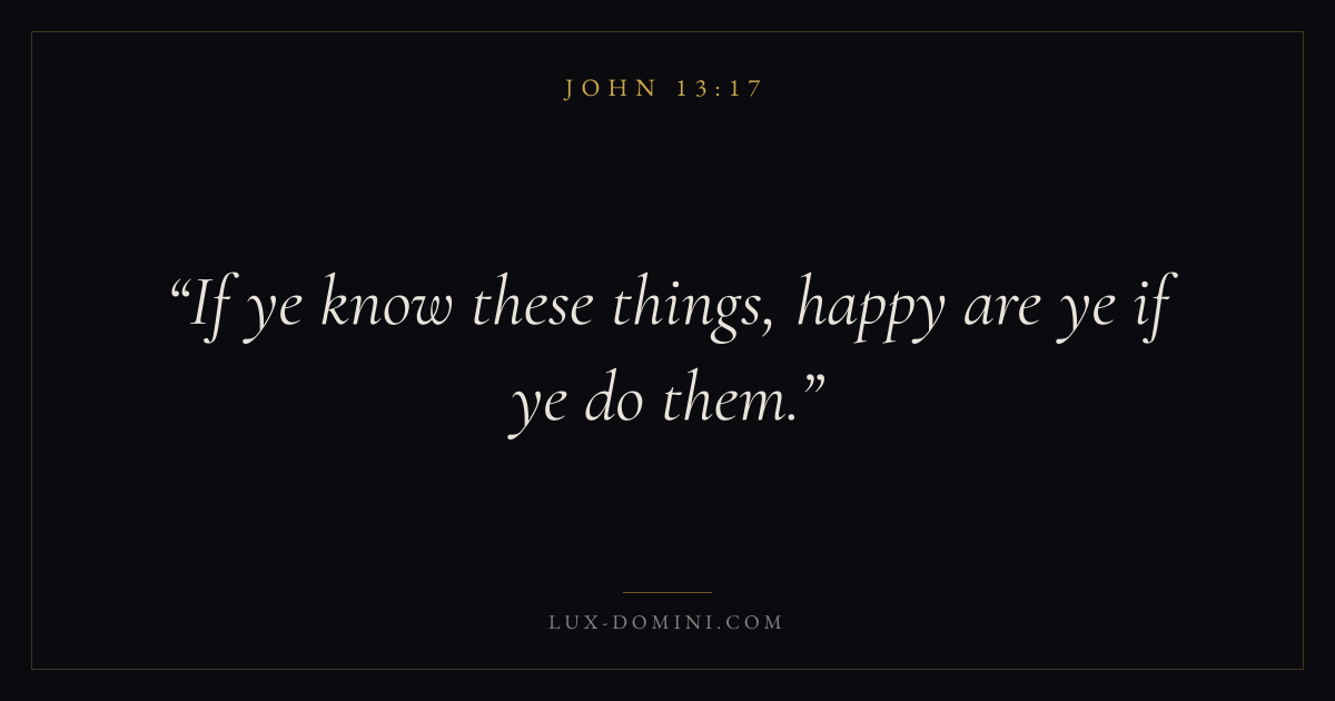 Books / John / Chapter 13 / Verse 17 ← John 13:16 John 13:17 John 13:18 → If ye know these things, happy are ye if ye do them. Download verse card Share on Twitter Share on Facebook Pin it ✦ Key themes LoveFaithTruthIncarnation Read with John 13:16John 3:161 Corinthians 13:4Hebrews 11:1 Related topics Bible verses about loveBible verses about faithBible verses about truth ✦ John Chapter 13 verses V. 1 V. 2 V. 3 V. 4 V. 5 V. 6 V. 7 V. 8 V. 9 V. 10 V. 11 V. 12 V. 13 V. 14 V. 15 V. 16 V. 17 V. 18 V. 19 V. 20 V. 21 V. 22 V. 23 V. 24 V. 25 V. 26 V. 27 V. 28 V. 29 V. 30 V. 31 V. 32 V. 33 V. 34 V. 35 V. 36 V. 37 V. 38