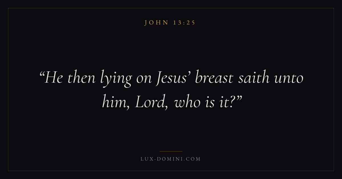 Books / John / Chapter 13 / Verse 25 ← John 13:24 John 13:25 John 13:26 → He then lying on Jesus’ breast saith unto him, Lord, who is it? Download verse card Share on Twitter Share on Facebook Pin it ✦ Key themes LoveFaithSuffering and trialsTruthIncarnation Read with John 13:24John 3:161 Corinthians 13:4Hebrews 11:1 Related topics Bible verses about loveBible verses about faithBible verses about suffering and trialsBible verses about truth ✦ John Chapter 13 verses V. 1 V. 2 V. 3 V. 4 V. 5 V. 6 V. 7 V. 8 V. 9 V. 10 V. 11 V. 12 V. 13 V. 14 V. 15 V. 16 V. 17 V. 18 V. 19 V. 20 V. 21 V. 22 V. 23 V. 24 V. 25 V. 26 V. 27 V. 28 V. 29 V. 30 V. 31 V. 32 V. 33 V. 34 V. 35 V. 36 V. 37 V. 38
