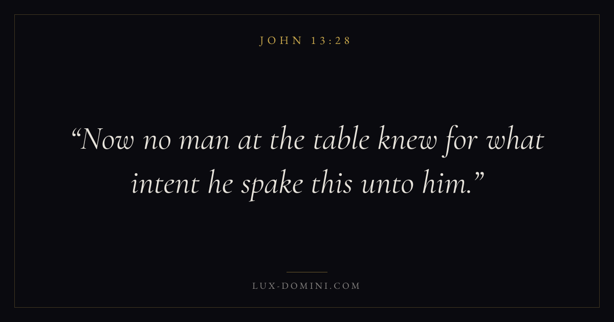 Books / John / Chapter 13 / Verse 28 ← John 13:27 John 13:28 John 13:29 → Now no man at the table knew for what intent he spake this unto him. Download verse card Share on Twitter Share on Facebook Pin it ✦ Key themes LoveFaithSuffering and trialsTruthIncarnation Read with John 13:26John 13:27John 3:161 Corinthians 13:4 Related topics Bible verses about loveBible verses about faithBible verses about suffering and trialsBible verses about truth ✦ John Chapter 13 verses V. 1 V. 2 V. 3 V. 4 V. 5 V. 6 V. 7 V. 8 V. 9 V. 10 V. 11 V. 12 V. 13 V. 14 V. 15 V. 16 V. 17 V. 18 V. 19 V. 20 V. 21 V. 22 V. 23 V. 24 V. 25 V. 26 V. 27 V. 28 V. 29 V. 30 V. 31 V. 32 V. 33 V. 34 V. 35 V. 36 V. 37 V. 38
