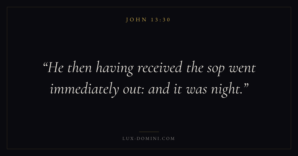 Books / John / Chapter 13 / Verse 30 ← John 13:29 John 13:30 John 13:31 → He then having received the sop went immediately out: and it was night. Download verse card Share on Twitter Share on Facebook Pin it ✦ Key themes LoveFaithSuffering and trialsTruthIncarnation Read with John 13:26John 13:27John 3:161 Corinthians 13:4 Related topics Bible verses about loveBible verses about faithBible verses about suffering and trialsBible verses about truth ✦ John Chapter 13 verses V. 1 V. 2 V. 3 V. 4 V. 5 V. 6 V. 7 V. 8 V. 9 V. 10 V. 11 V. 12 V. 13 V. 14 V. 15 V. 16 V. 17 V. 18 V. 19 V. 20 V. 21 V. 22 V. 23 V. 24 V. 25 V. 26 V. 27 V. 28 V. 29 V. 30 V. 31 V. 32 V. 33 V. 34 V. 35 V. 36 V. 37 V. 38