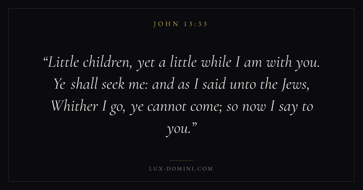 Little children, yet a little while I am with you. Ye shall seek me: and as I said unto the Jews, Whither I go, ye cannot come; so now I say to you.